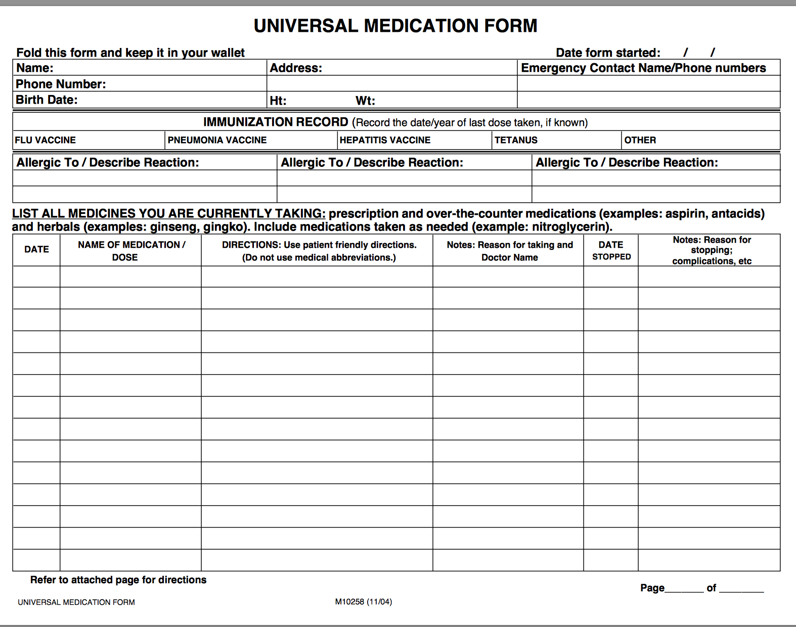 - Maintain a universal medication sheet with immunizations, and allergies and carry a copy of it with you.
